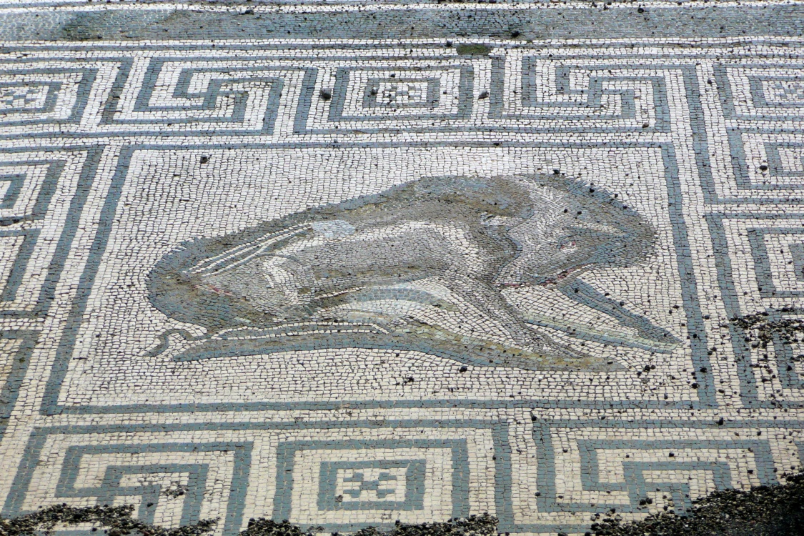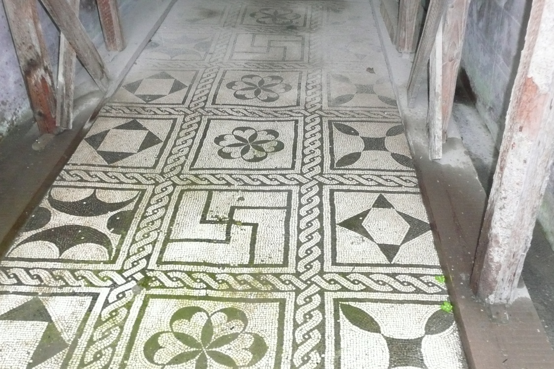 MosaikMosaikbelag im Hauseingangsbereich. Die einfachen Verzierungen sind an der Ausgrabungsstätte verblieben, die schönsten Mosaiken sind heute im archäologischen Nationalmuseum ausgestellt. |