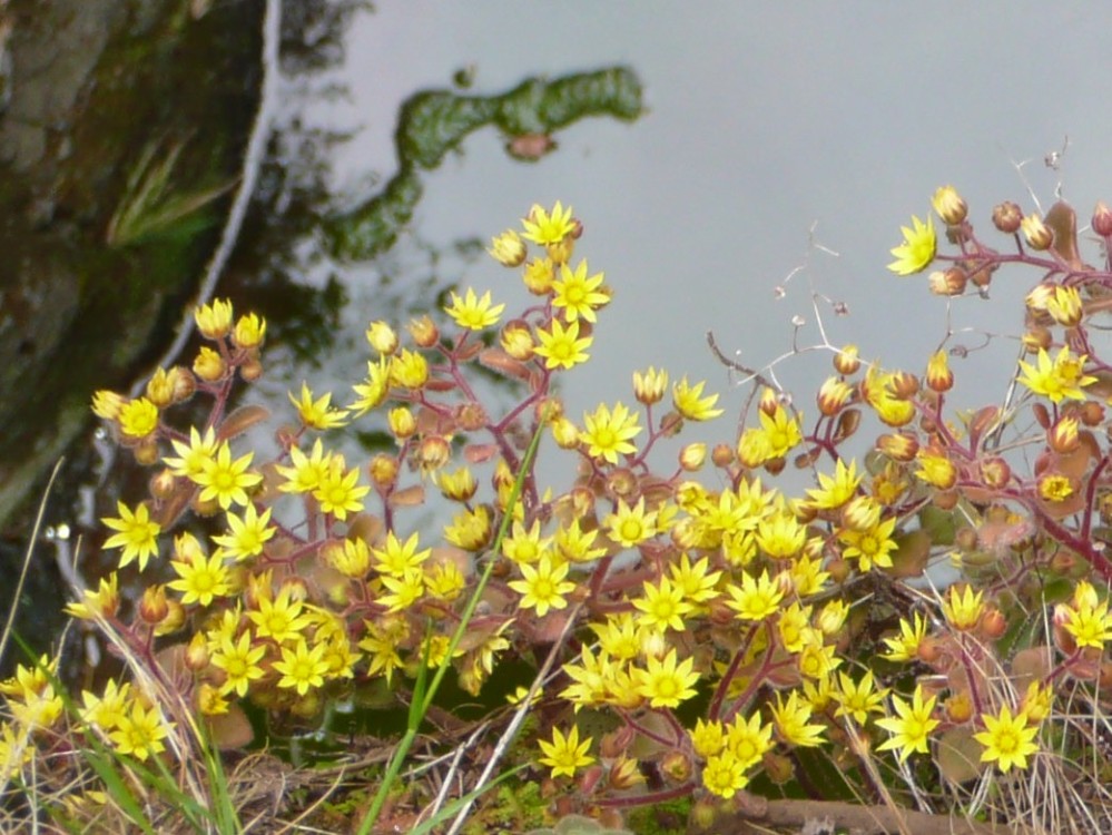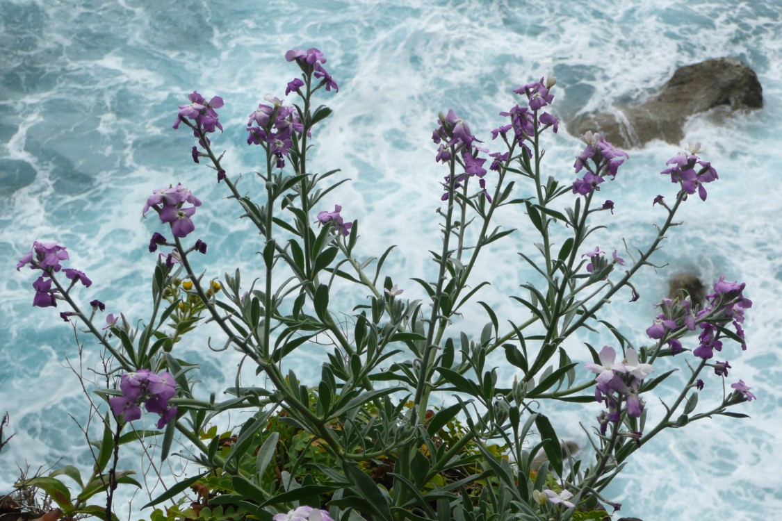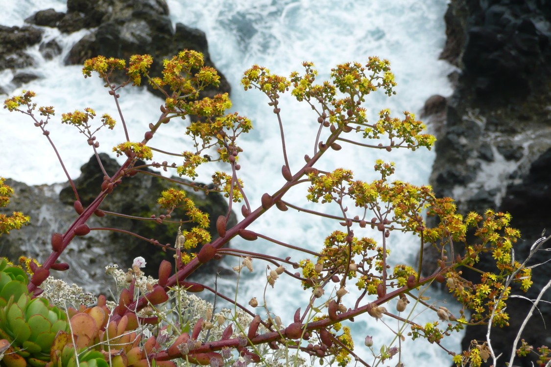 DachwurzDachwurz-Blüten oberhalb der tosenden Brandung. |