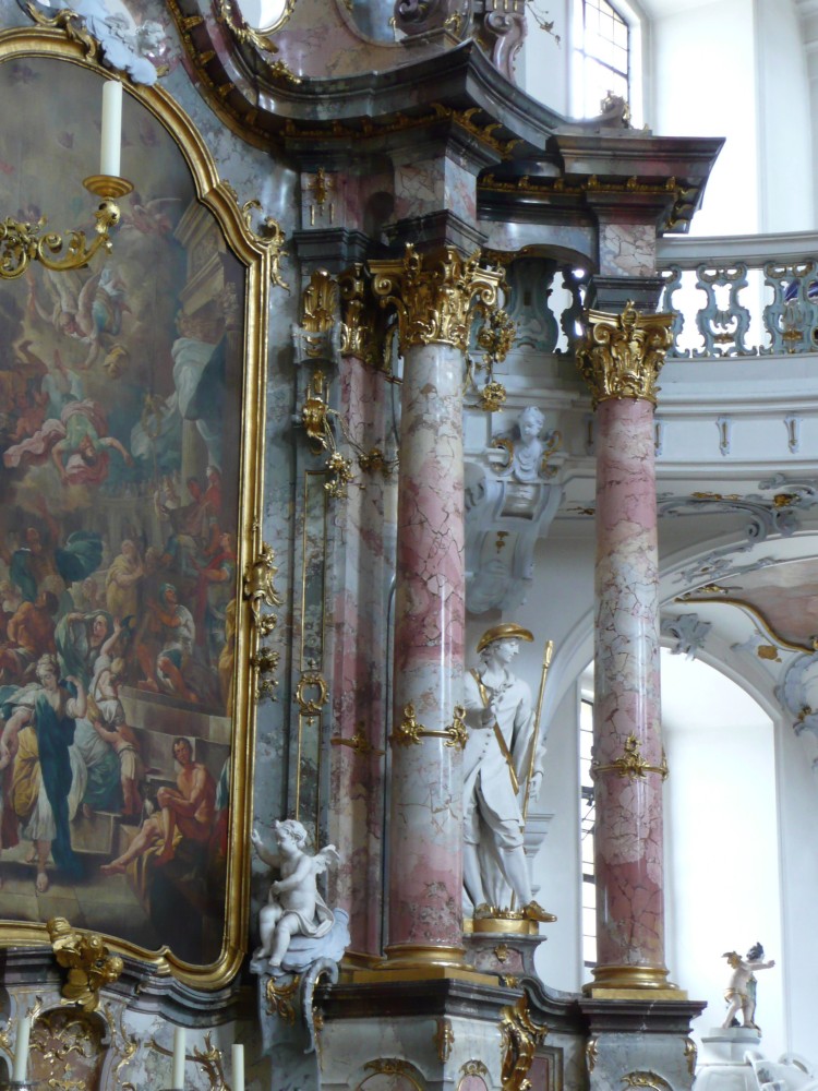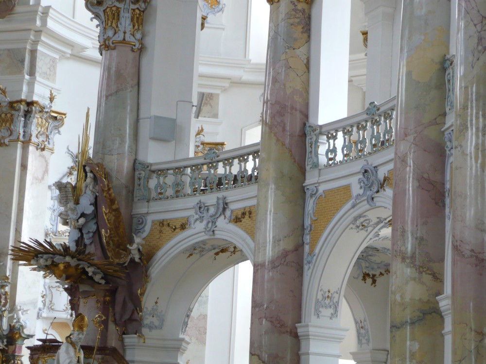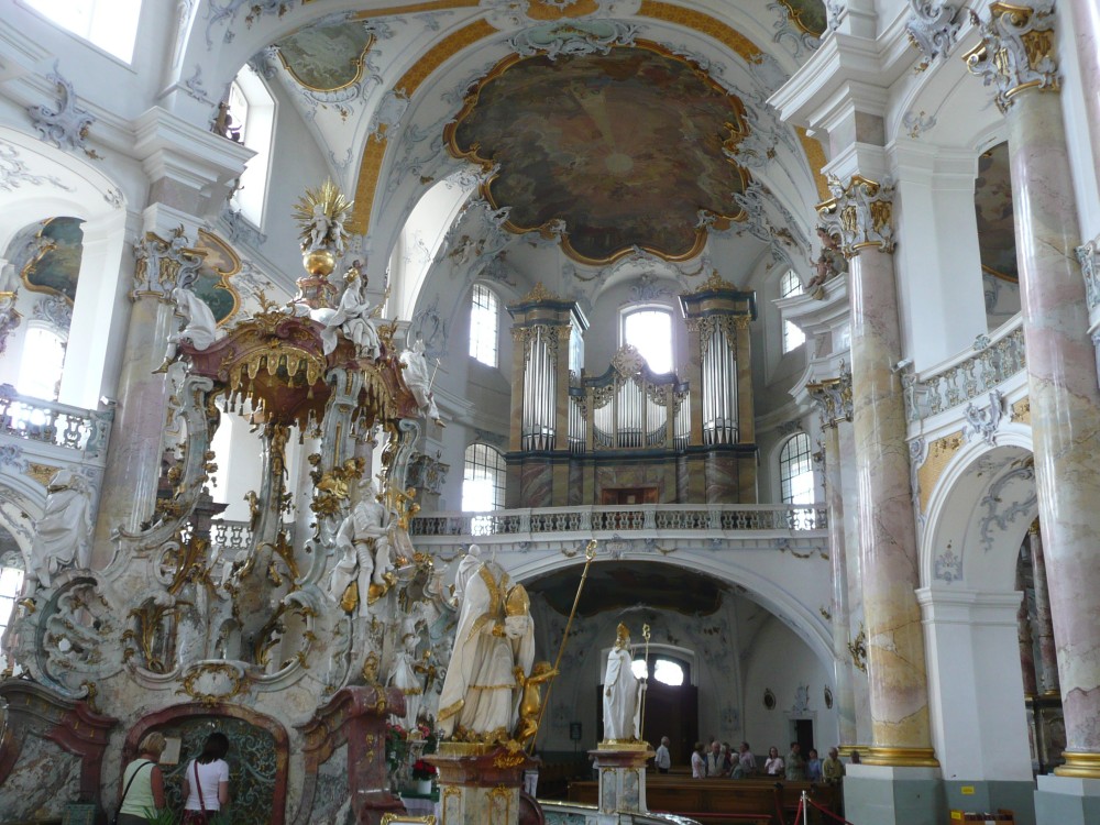 KirchenschiffDie Wallfahrtkirche ist den heiligen Vierzehn Nothelfern geweiht und empfängt etwa eine halbe Million Besucher pro Jahr. |