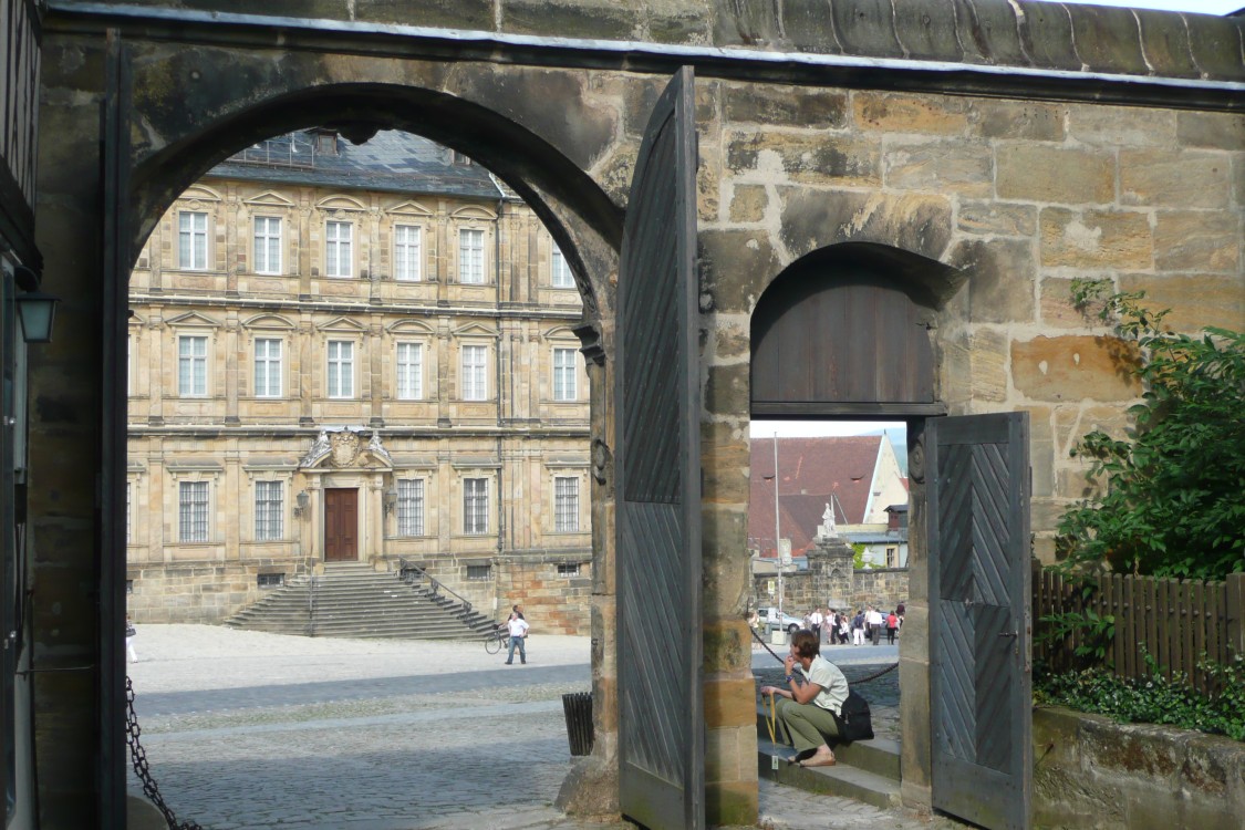 TorBlick vom Domherrenhof auf die Treppe der Neuen Residenz. |