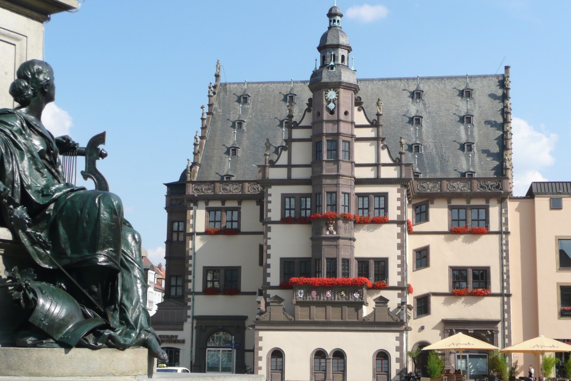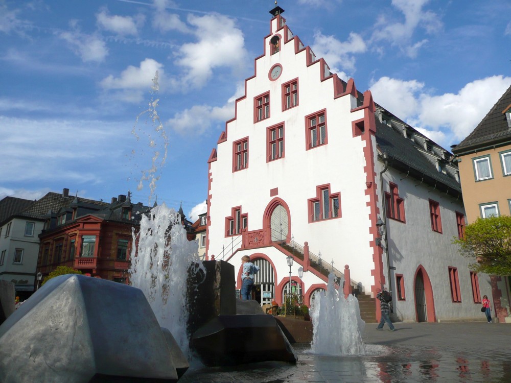 Rathaus SchweinfurtDas Rathausplatz von Schweinfurt war am Sonntagnachmittag groß und leer; die vielen Cafés wie ausgestorben. |
