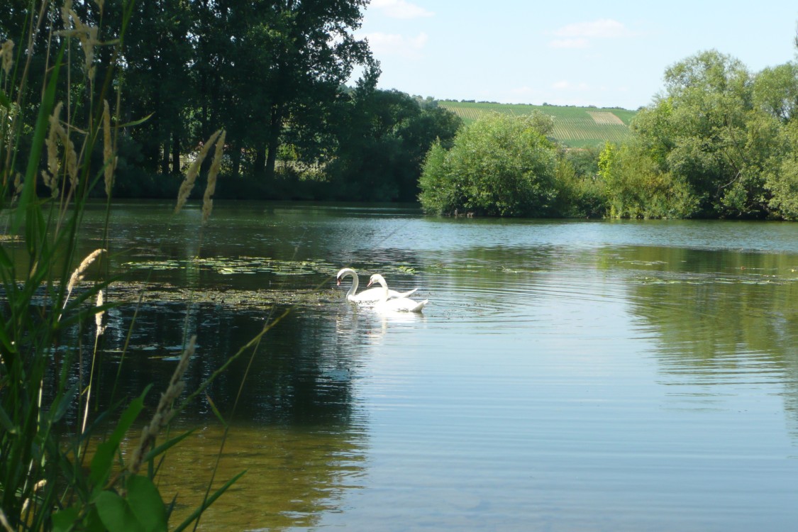 SchwäneDer Main bei Marktsteft - letzte idyllische Rast bevor Straßen, Bahn und Fährverkehr sich gemeinsam durchs Tal quetschen. Ab und zu kommen Lastkähne vorbei. Weinberge im Hintergrund. |