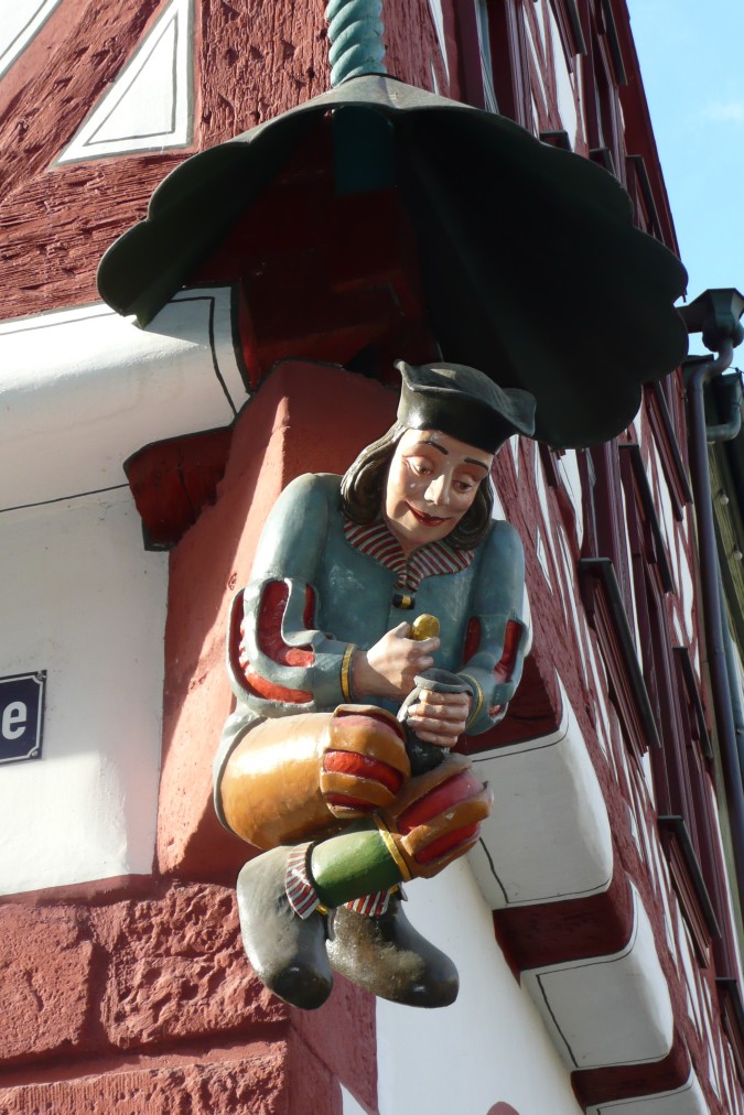 EckenhockerFigur am Gebäudeeck des Gasthaus "Zur Rose" in Karlstadt. |