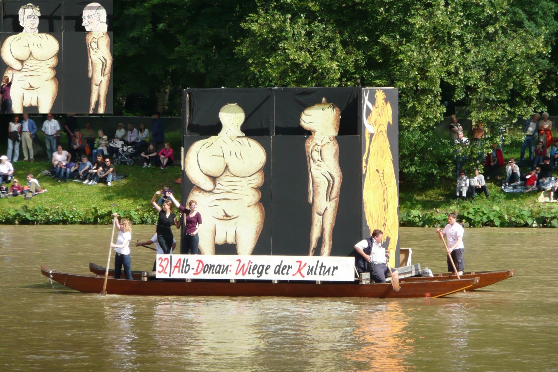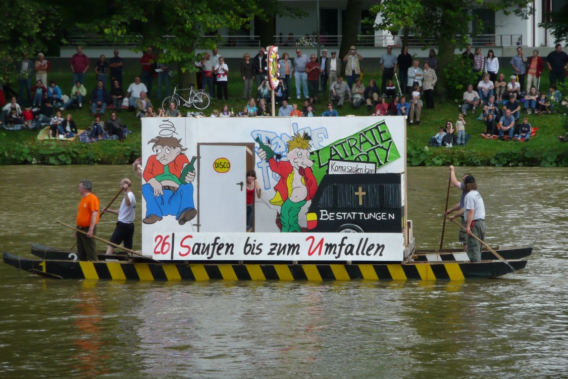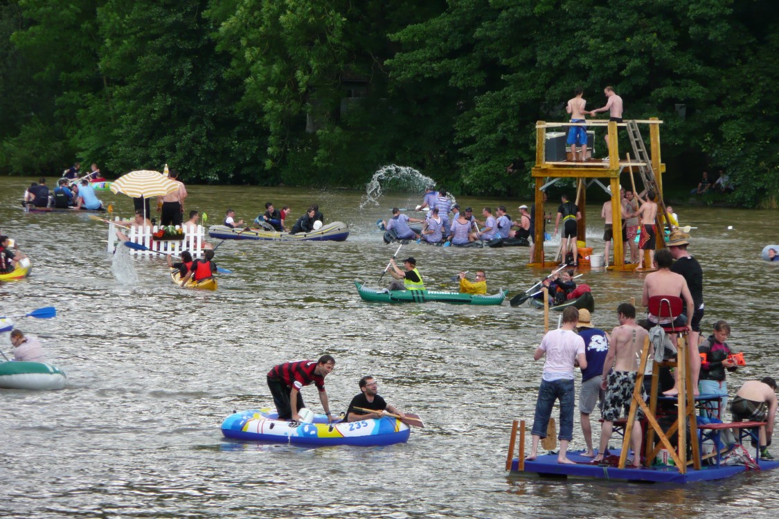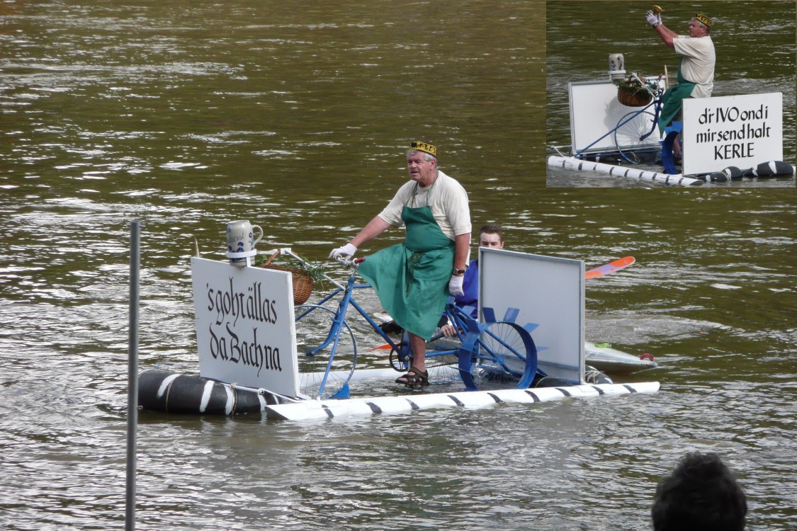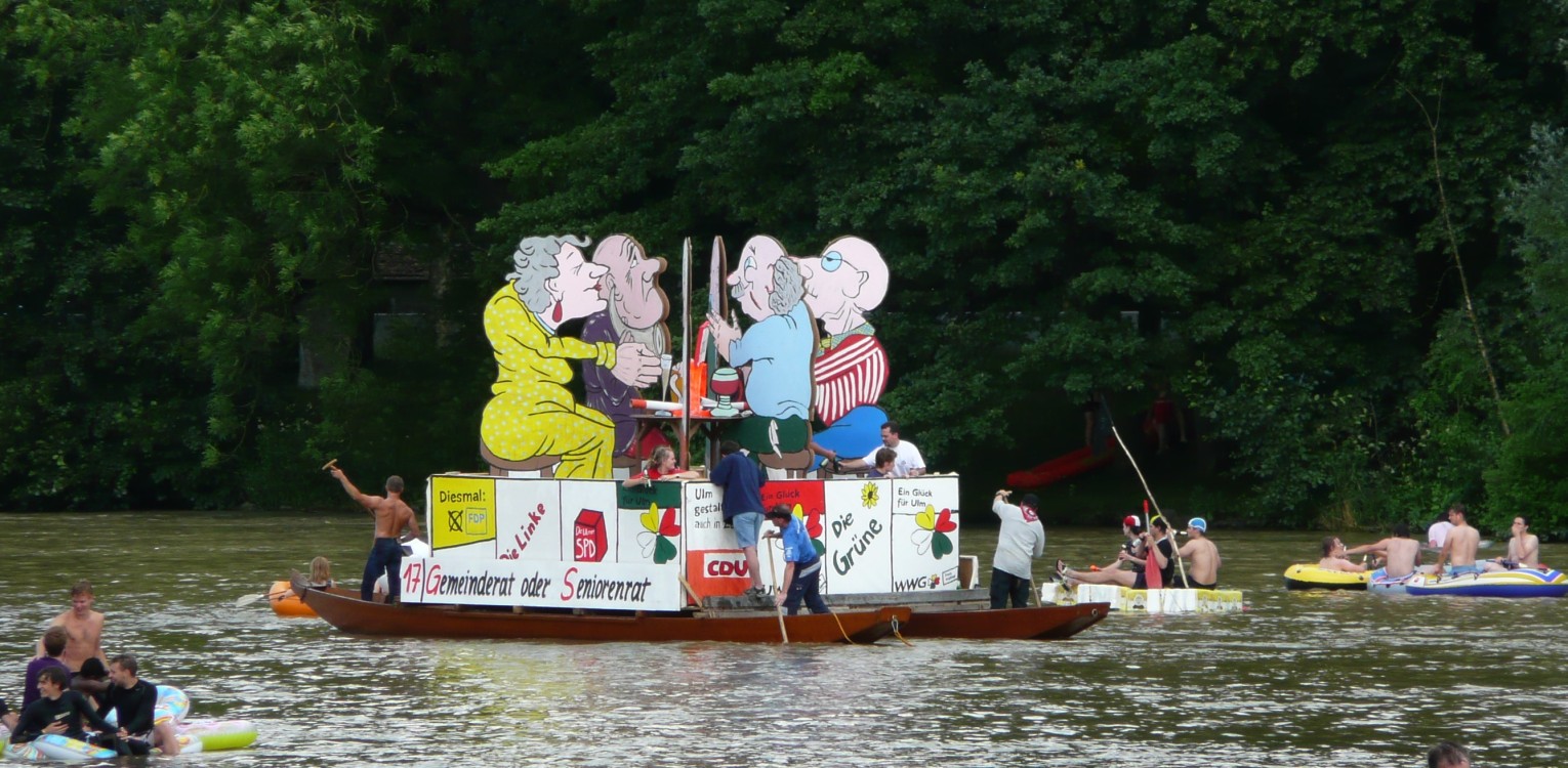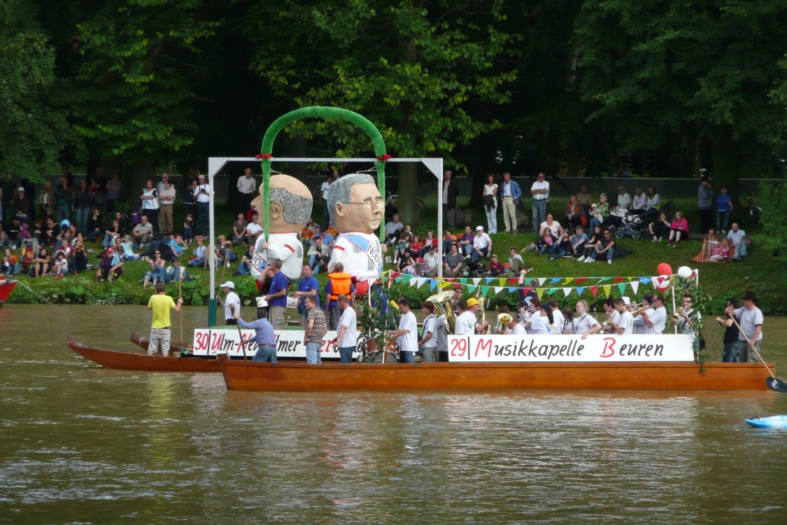 Nach alter Tradition wird in Ulm am Schwörmontag, dem dritten Montag im Juli, das Nabada, der lokale "Nationalfeiertag", ausgiebig gefeiert. 2008 ist das Nabada wegen Hochwasser und Treibgut ausgefallen - ganze Bäume waren stromabwärts geschwommen. Auch dieses Jahr hat es Hochwasser, aber das Nabada findet trotzdem statt. Evtl. war die Messlatte für eine Absage etwas höher gelegt worden. Vor 3 Wochen hatte es bis auf 1500 m herab nochmals geschneit. Dementsprechend kalt war das Wasser - 13 Grad. Dadurch haben wir deutlich weniger "wilde Nabader", aber trotzdem tausende Zuschauer.
