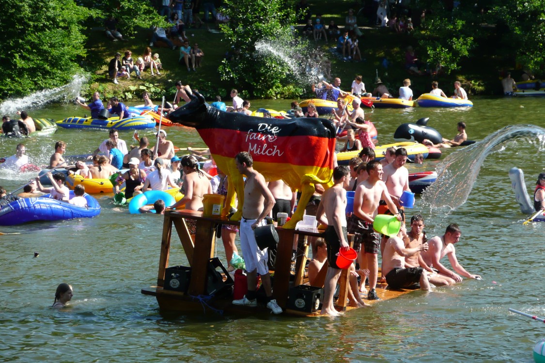 Die faire MilchSogar eine deutsche Kuh wurde mit aufs Wasser genommen. Bei so schönem Wetter sind die wilden Nabader gut gelaunt, nass-spritzen sorgt für angenehme Abkühlung. |