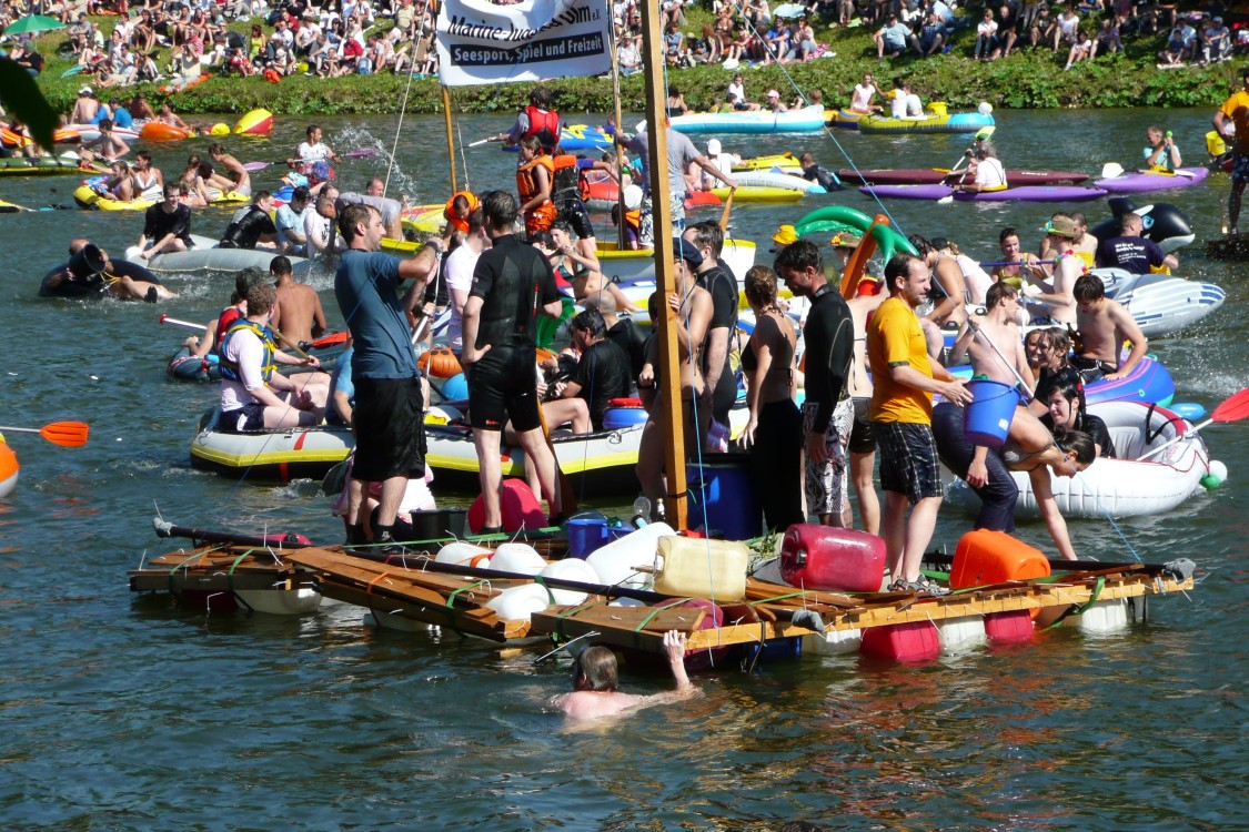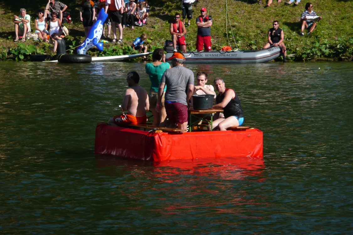 HolzfloßBeliebt sind Holzflöße aus Paletten. Das Holz alleine trägt keine Passagiere; meistens werden Plastikkanister verbaut. |