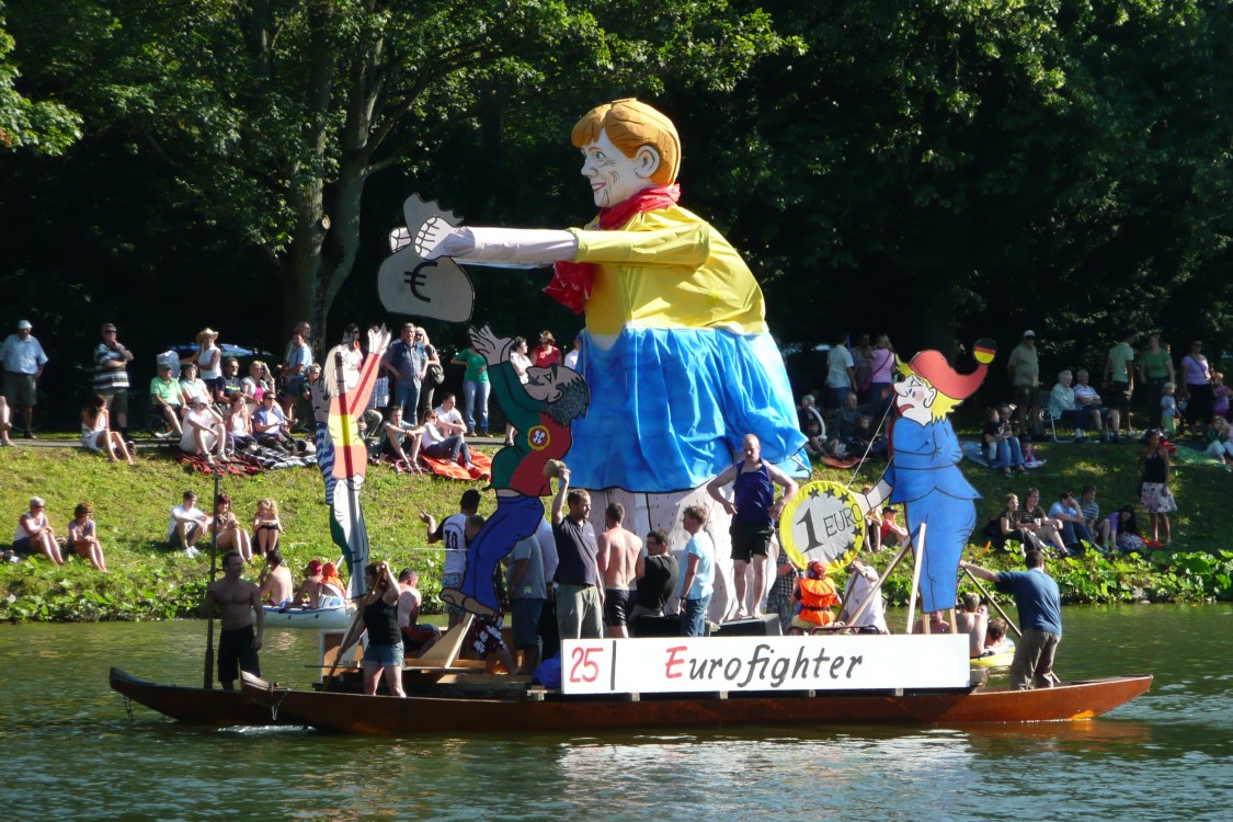 EurofighterAngie verteilt die Milliarden ... im Karussell darunter recken sich Grieche, Portugiese und Spanier danach ... und damit das alles klappt, schiebt ihr der deutsche Michel hinten die Euros rein. Dazu wird immer mal wieder das Röckchen hinten angehoben, mit viel Krach und Getöse.Die Zoll-Zillenfahrer aus Gögglingen/Donaustetten haben mit diesem Beitrag den 1. Preis des Nabada 2010 gewonnen. |