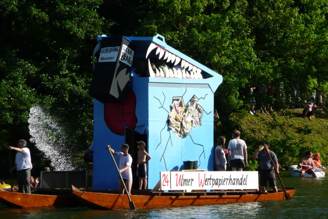 Ulmer SpatzEin Klassiker, immer mal wieder anders dargestellt:Der Ulmer Spatz darf bei Nabada nicht fehlen. Als die Ulmer beim Bau des Münsters mit einem Balken quer vor dem Stadttor standen und darüber diskutierten, ob Sie das Stadttor einreißen oder den Balken kürzen sollten, sahen sie einen Spatzen beim Nestbau, der einen Strohhalm längs durch eine Öffnung bugsierte. Zur Erinnerung sitzt der Ulmer Spatz heute auf dem Dach des Ulmer Münsters. |