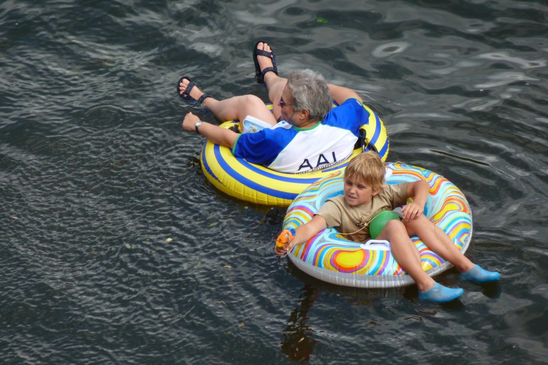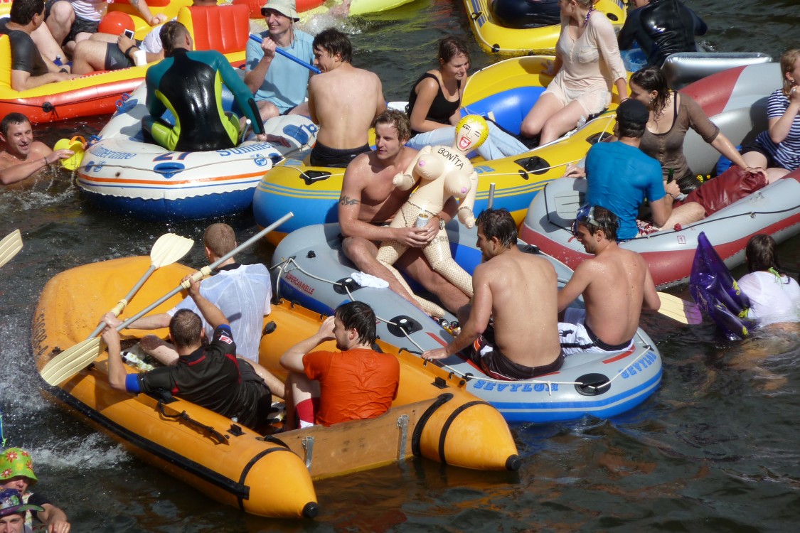Schlauchboot-ArmadaWeniger "wilde Nabader" als letztes Jahr, aber bei 20 Grad Aussen- und 15 Grad Wassertemperatur beachtlich. Das Salz in der Suppe beim Nabada sind die so genannten wilden Nabader, nicht offizielle, private Boote, bzw. eigentlich alles was sich zum "bada" auf der Donau mehr oder weniger eignet. |