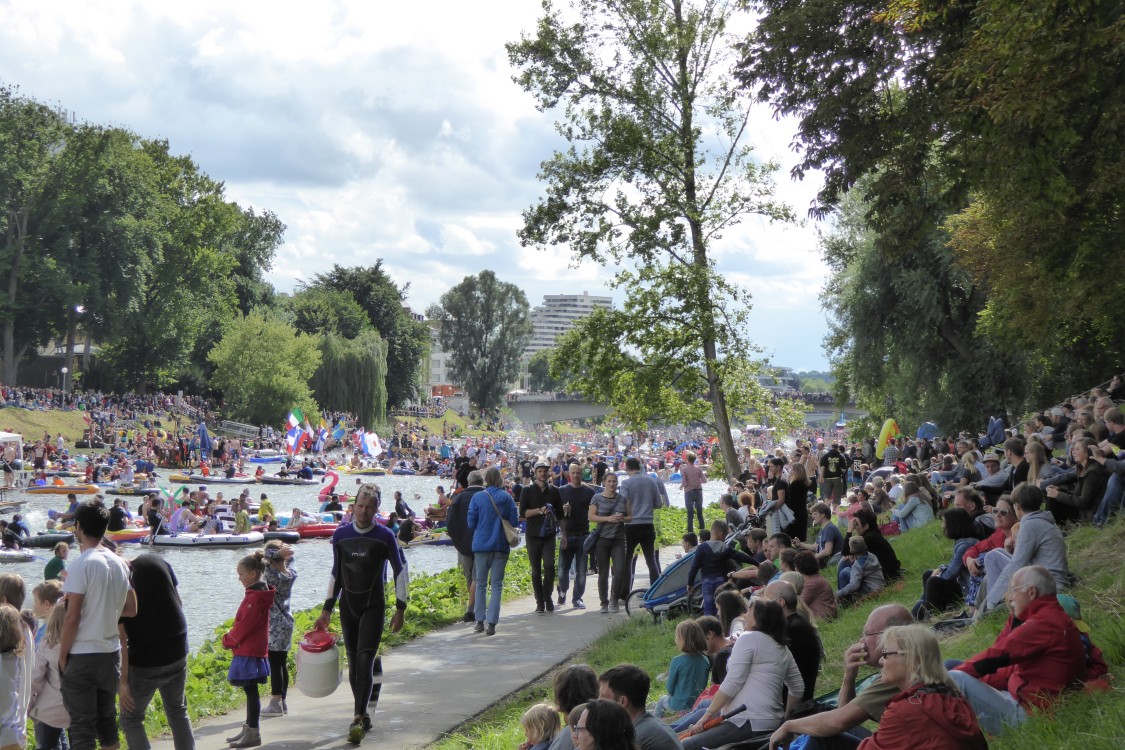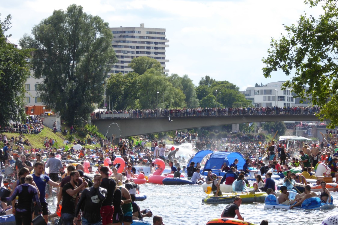 ZuschauerbrückeDie spritz-sichersten Plätze sind auf den Donaubrücken - und man hat einen schönen Blick auf das "Getümmel". |