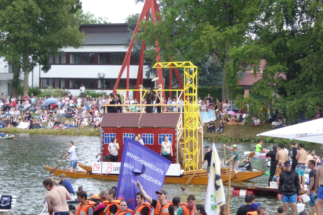 Menschenrechte nicht untergehen lassenSehr passend zu den Wasserschlachten beim Nabada, ein Boot mit vielen roten Rettungsringen und Rettungswesten als Mahnung. |