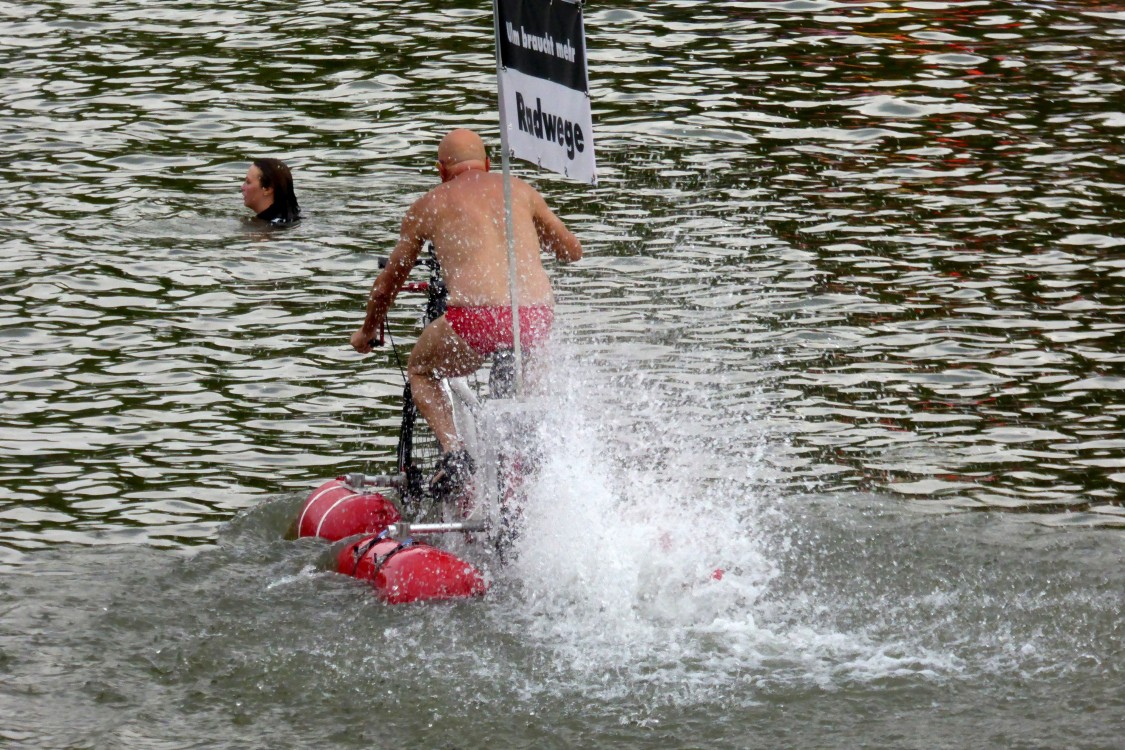 Ulm braucht mehr RadwegeEin gelungener Nach-Abschluss, der viel Applaus bekam: ein älterer Herr mit Badehose per Rad auf der Donau bittet um mehr Radwege für Ulm. |