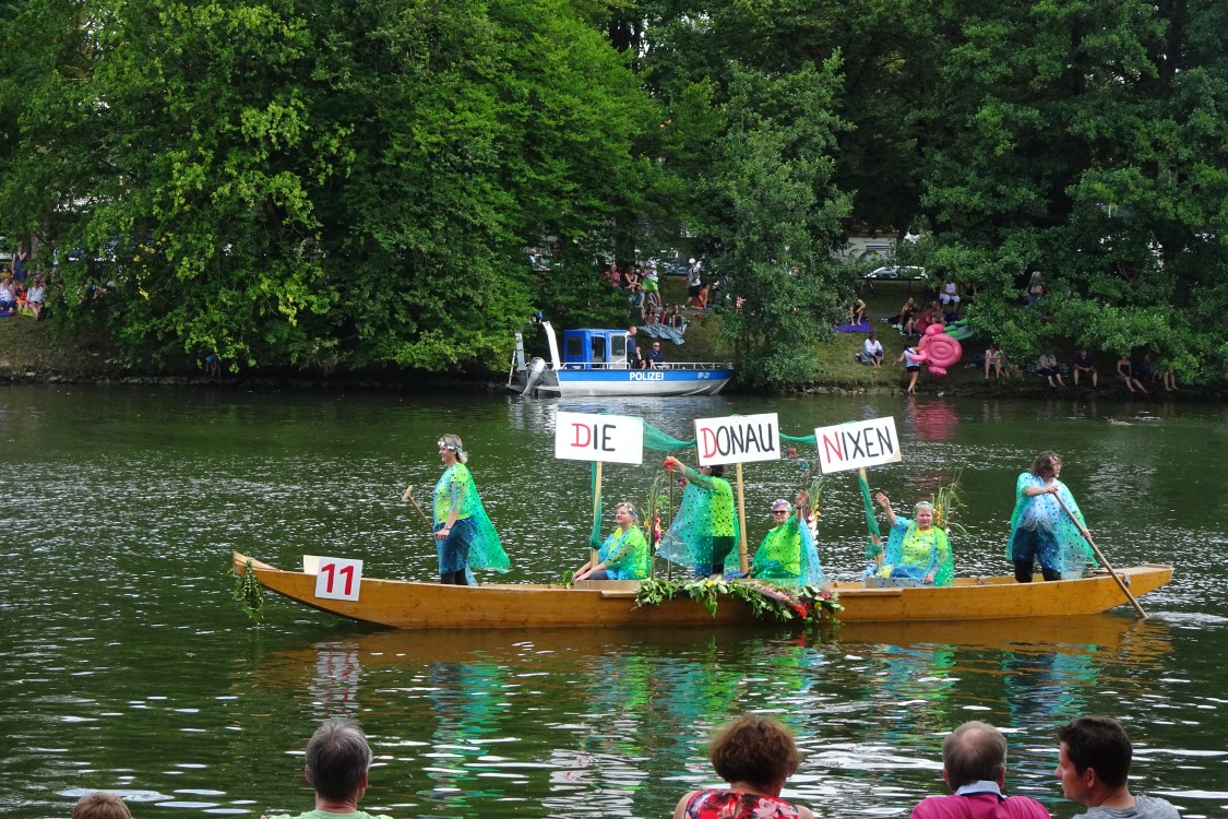 Die Donau NixenJedes Jahr mit dabei sind die stimmungsvoll dekorierten Donaunixen. Sie schaffen es vorne mit dabei zu sein, bevor die wilden Wasserschlachten dem farbenfrohen Bild zusetzen. |
