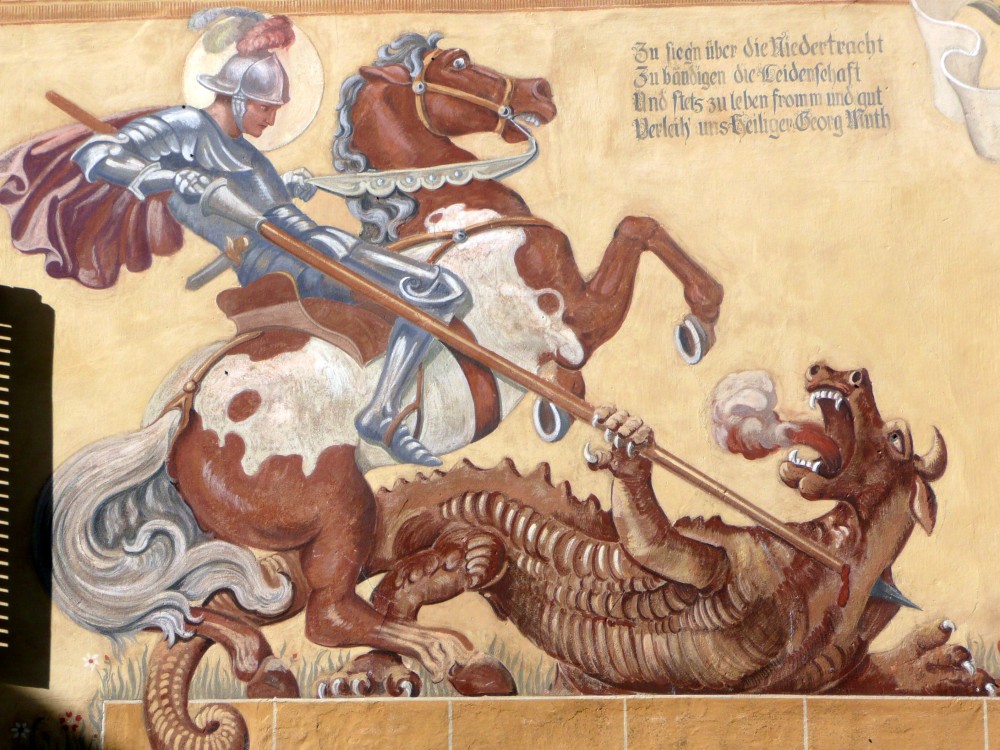 LüftlDrachentöter auf einem Lüftl in Kastelruth:zu bändigen die Leidenschaft und stets zu leben fromm und gut verleih' uns Heiliger Georg Mut. |