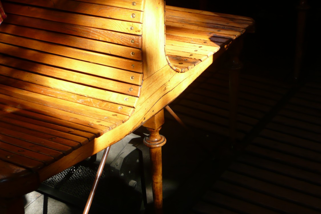 BankBank der Rittenbahn, stilvoll restauriert und repariert. Der Riss im Holz ist geleimt und die Leisten sind mit Messingschrauben befestigt, im Stil des Herstellungsjahrs 1907. Hier wurde bewust auf Kreuzschlitzschrauben oder gar Spax verzichtet. Der gedrechselte Fuß ist ein besonders schönes Detail. |