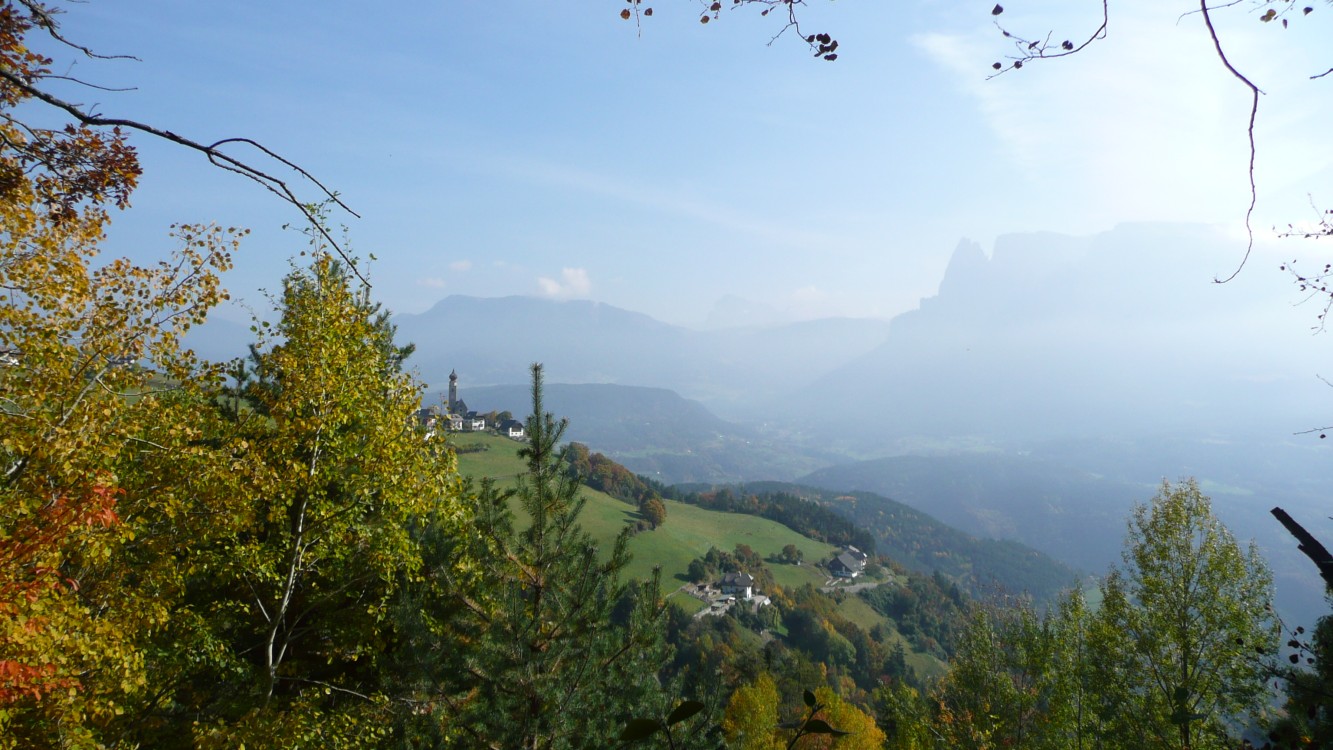 St. NikolausIm Vordergrund St. Nikolaus in Mittelberg. Rechts mit dem markanten Zacken - der Schlern. In der Mitte im Hintergrund - im Dunst der Langkofel.. |