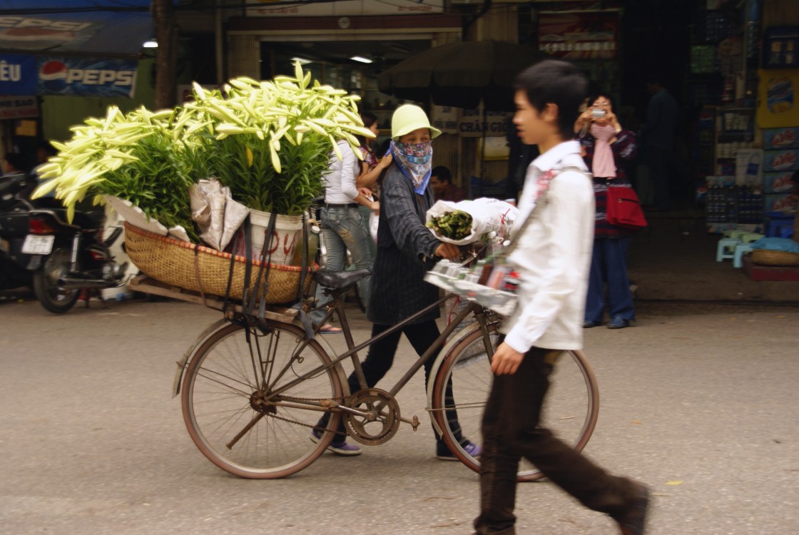 schnelle BlumenverkäuferÜberall in Hanoi verkaufen Frauen weiße Lilien. Mit dem Fahrrad ziehen die Verkäuferinnen durch die Straßen der Hanoier Altstadt. |