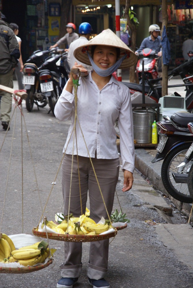 Trägerin mit BananenVietnamesin mit landestypischem Hut verkauft Bananen auf der Straße. |