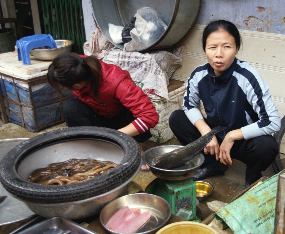 AalMarkttreiben in Hanoi: Fische, Aale, Schlangen und Meerestiere werden lebend angeboten und nach Auswahl durch die Einkäufer für den Kochtopf zu Hause präpariert. |