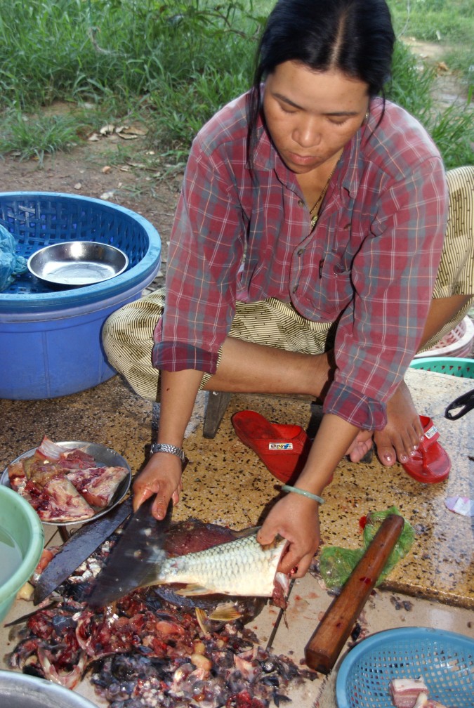 Fische ausnehmenGerade schwimmt der Fisch noch im Bottich im Kreis - einen Augenblick später verschwindet er kopflos und 'geschuppt' in der Plastiktüte am Lenker des Motorrad-Einkäufers. |