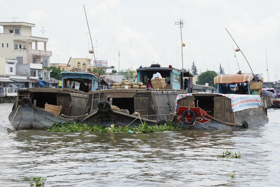 Schwimmender MarktWir näheren uns einem der vielen 'floating markets' auf dem Mekong, das gleiche bunte und quirlige Treiben der Märkte in Saigon und Hanoi spielt sich hier auf dem Wasser ab... |